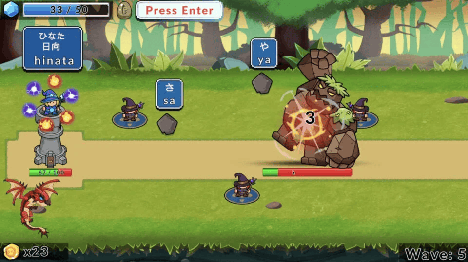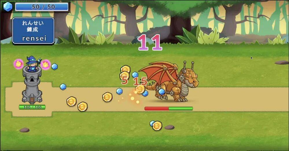 玩家通过输入日文/罗马音单词来发动魔法、击退敌人,打倒敌人后积累MP,再用MP 进行攻击、防线构筑、强化等操作;视频里还提到“首字母不重复的题目生成”“灵活输入判定”“连击与金币奖励”“召唤系统”等设计点。