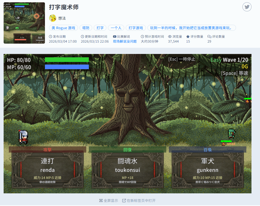 这个名为《打字魔术师》的游戏,作者给出的分类标签为“类Rogue”“打字”和“塔防”,玩家同样需要通过输入日语罗马音来发动攻击或者使用回复道具。我自己试了试,游戏不仅提供了三个职业选择,每个职业还配备了丰富的可选技能和装备。
