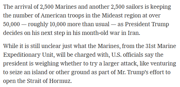 《纽约时报》3月29日报道,随着2500名海军陆战队队员和另外2500名海军士兵抵达,美国在中东地区的驻军人数超过了5万人,比非冲突时期增加约1万人。《华盛顿邮报》此前一天的报道说,五角大楼正在为在伊朗开展“为期数周的地面行动”做准备。