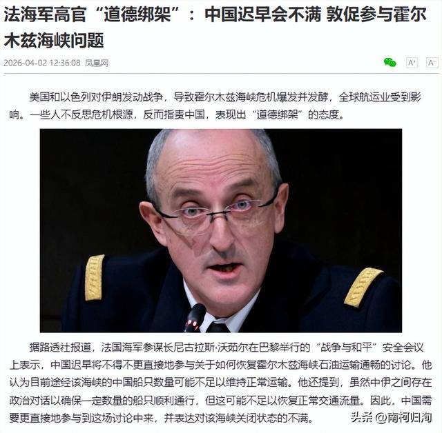 当地时间2026年4月1日,法国海军参谋长尼古拉斯·沃茹尔在巴黎“战争与和平”安全会议上,公然指责中国在中东危机中“袖手旁观”,甚至要求中国出兵中东、介入霍尔木兹海峡事务。