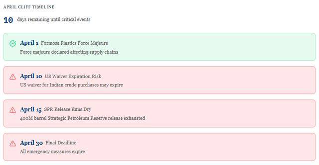ProfitGate Capital Services LLP创始人Nakul Sarda正在追踪以下指标的组合:(i)航运保险保费——假设在达到“警报解除”状态时保险公司会下调价格;(ii)实时船只过境监控;(iii) 迪拜与布伦特原油之间的价差;(iv)追踪其所谓的“四月中旬悬崖点”。