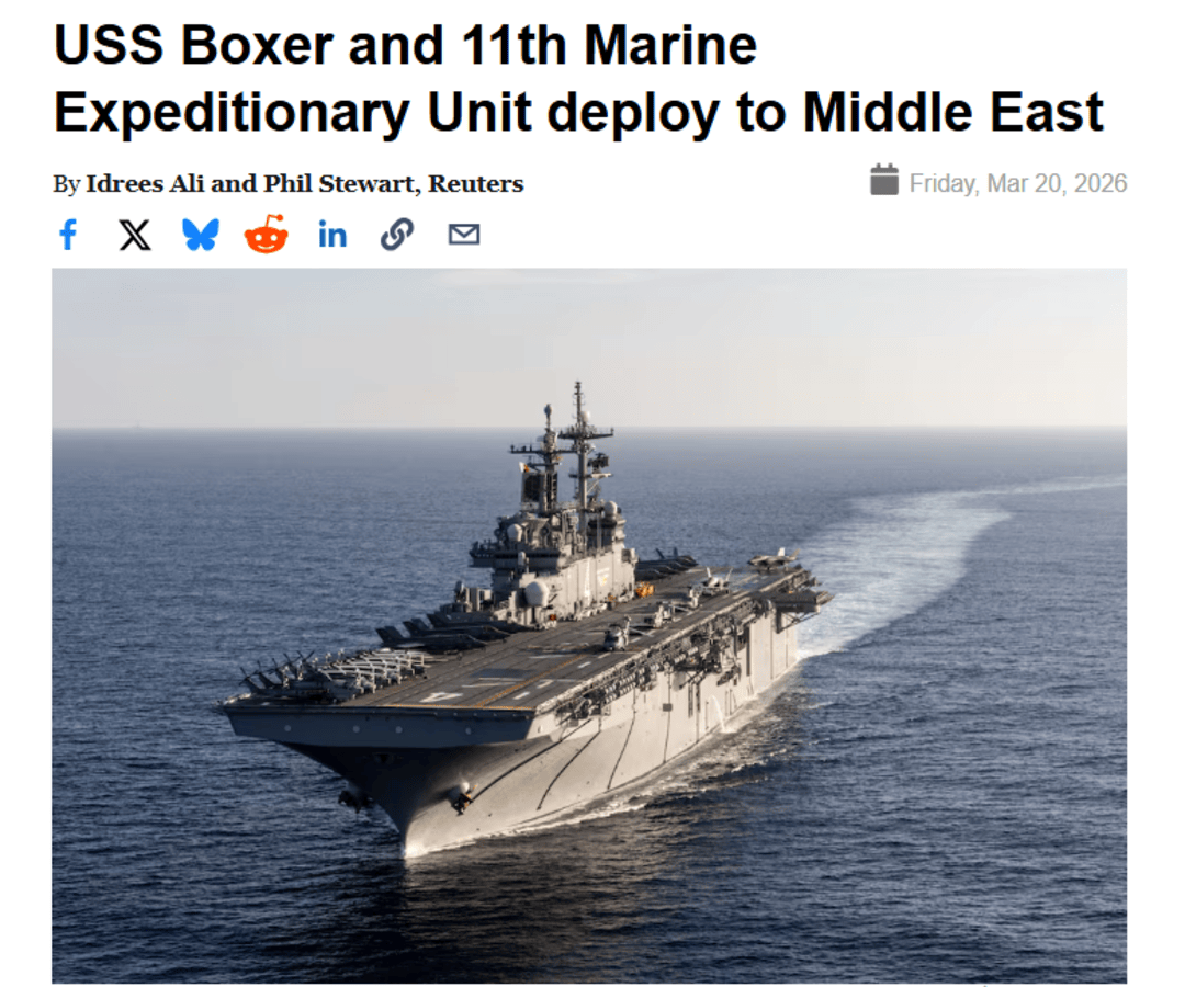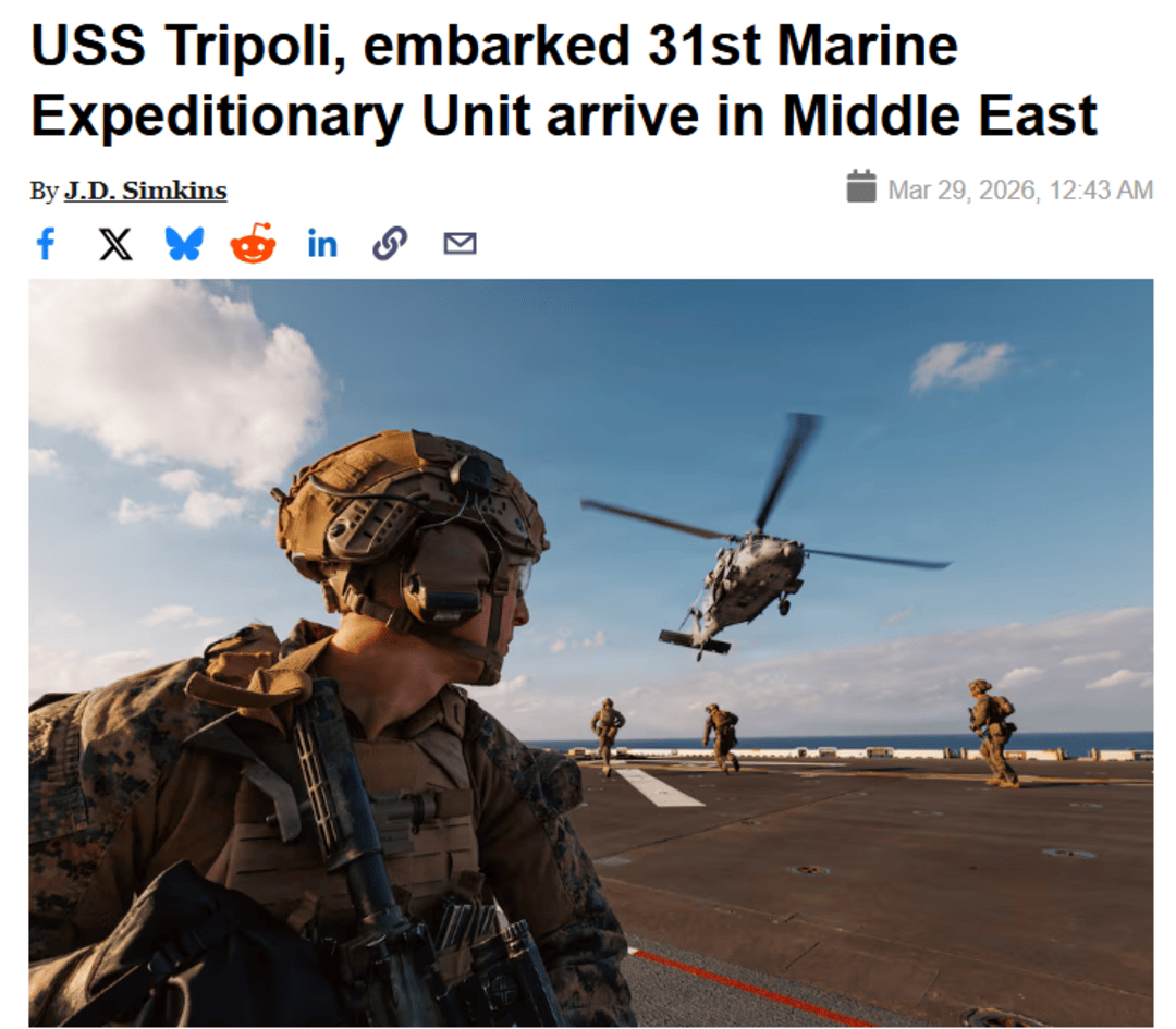 在冲突持续的背景下,美国正不断向中东地区增兵。当地时间3月27日,新一批约3500名美军搭乘“的黎波里”号(USS Tripoli,LHA-7)两栖攻击舰抵达美国中央司令部辖区,其中包含约2500名美国海军陆战队员。