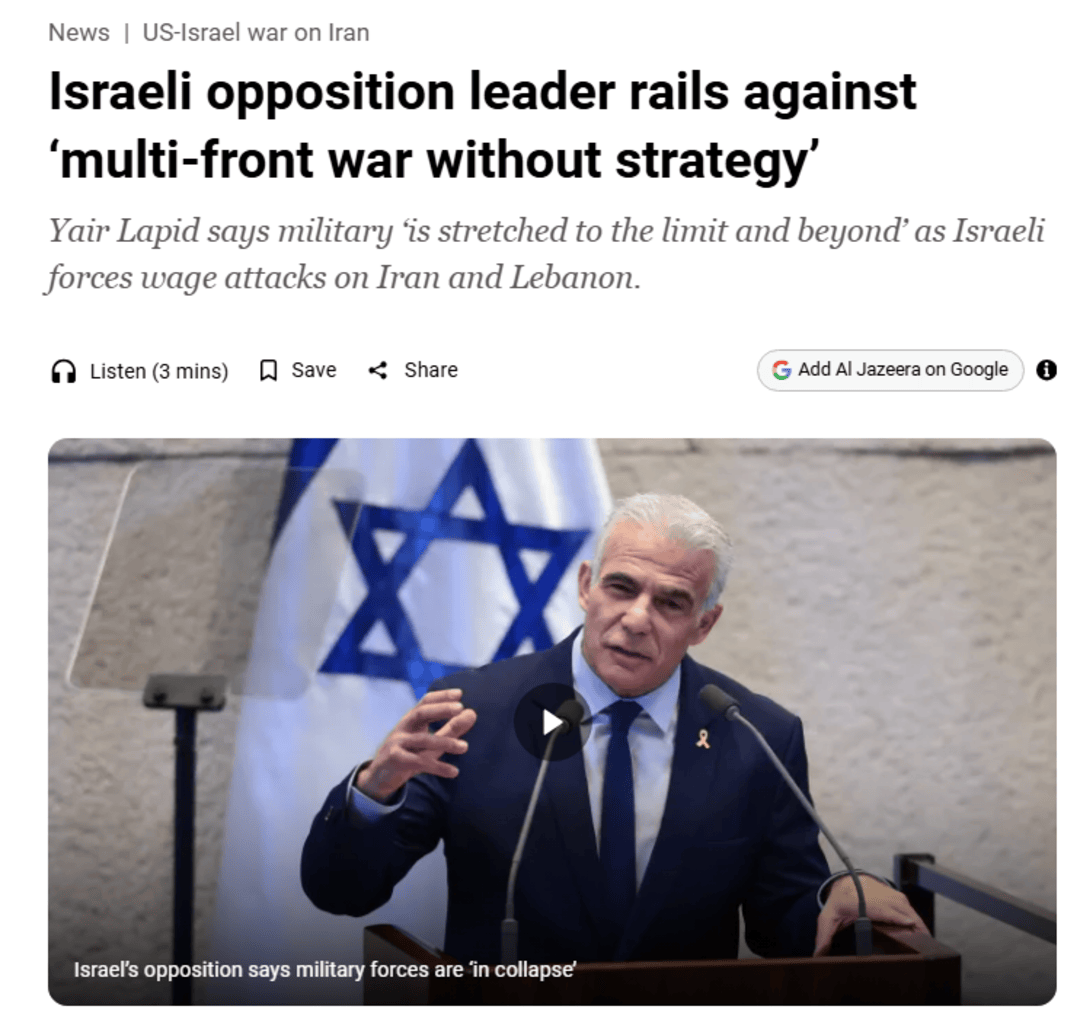 不过,在以色列国内,反战的声浪同样在提升,反对党“拥有未来”党领导人、前总理拉皮德批评内塔尼亚胡“缺乏战略”,“多线作战”则让以军疲惫不堪。