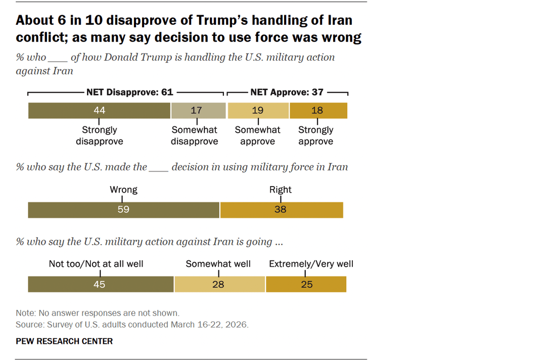 皮尤研究中心(Pew Research)3月25日发布的民调数据显示:61%的美国受访者不赞成特朗普政府处理冲突的方式。约59%的受访者认为,发动军事打击是一个“错误的决定”。