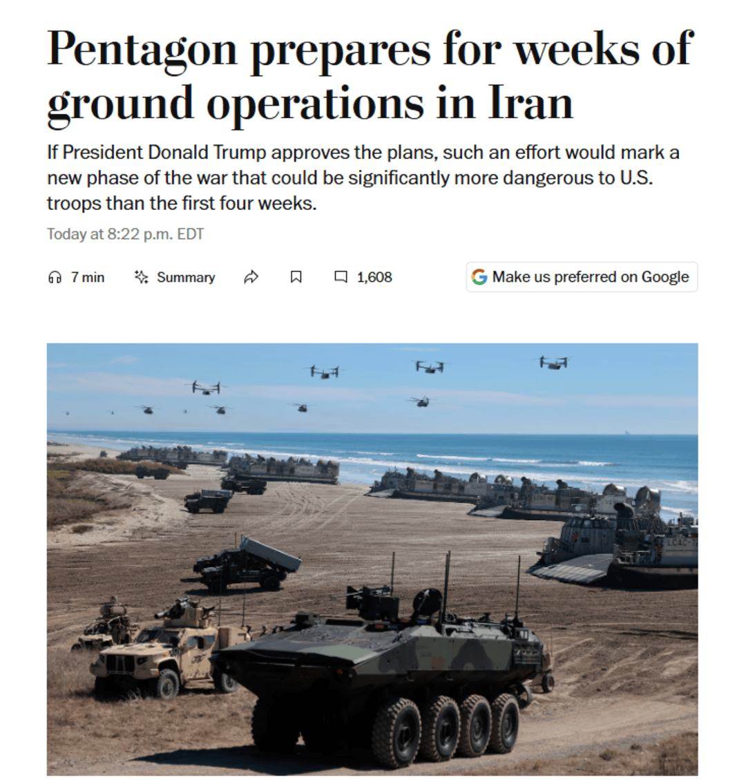 当地时间3月28日,有报道称,美国国防部正为在伊朗展开为期数周的地面行动做准备。
