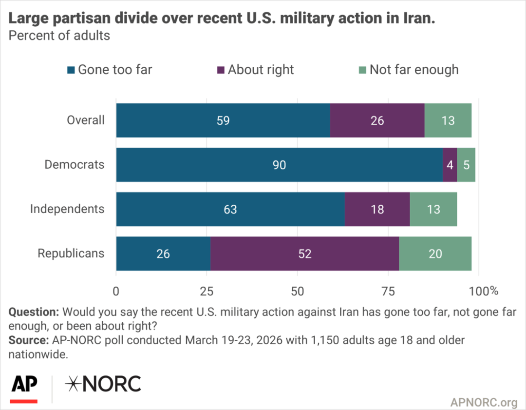 美联社-芝加哥大学全国民意研究中心3月25日发布的民调数据也显示,59%的美国受访者认为对伊朗的军事行动“做得太过火了”(Gone too far)。