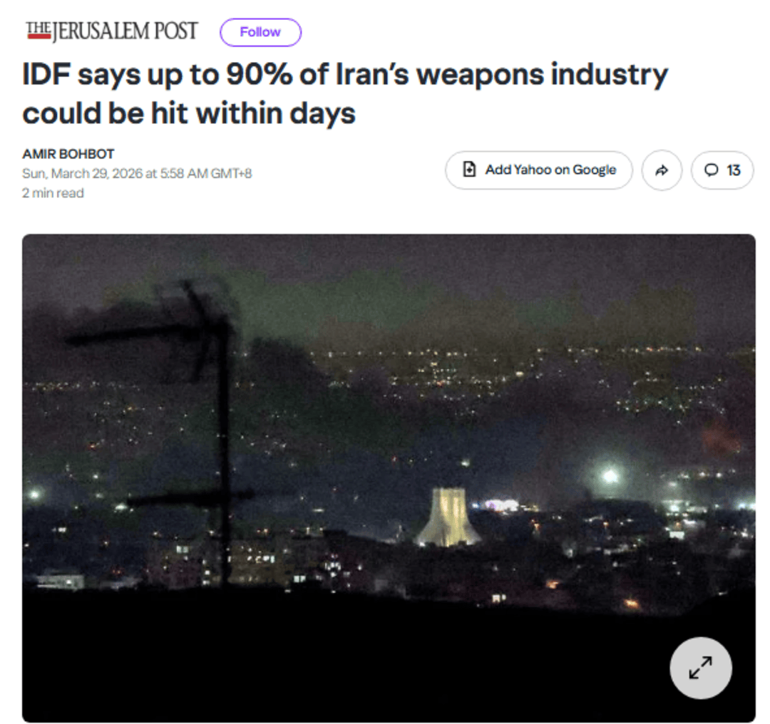 3月28日,以色列国防部官员则宣称,已经“摧毁或严重破坏了”伊朗约70%的军事工业能力。预计在“未来几天内”就能摧毁伊朗90%的军事工业基础设施,包括导弹组装线、研发中心和海军资产等。