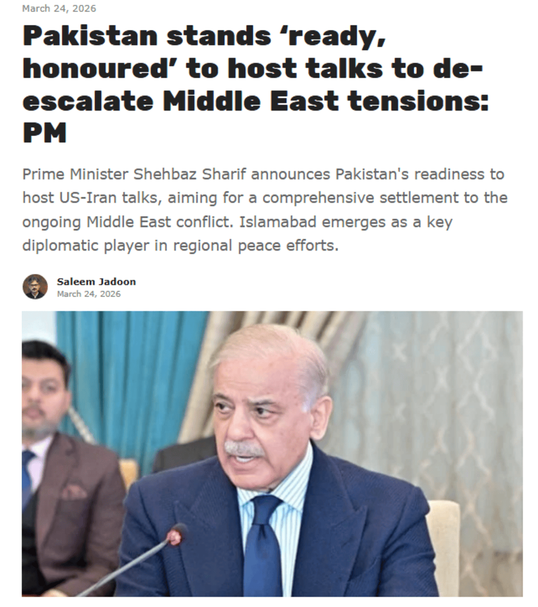 3月24日,巴基斯坦总理夏巴兹表示,如果得到美伊双方同意,巴基斯坦愿担任东道主,推进双方谈判。