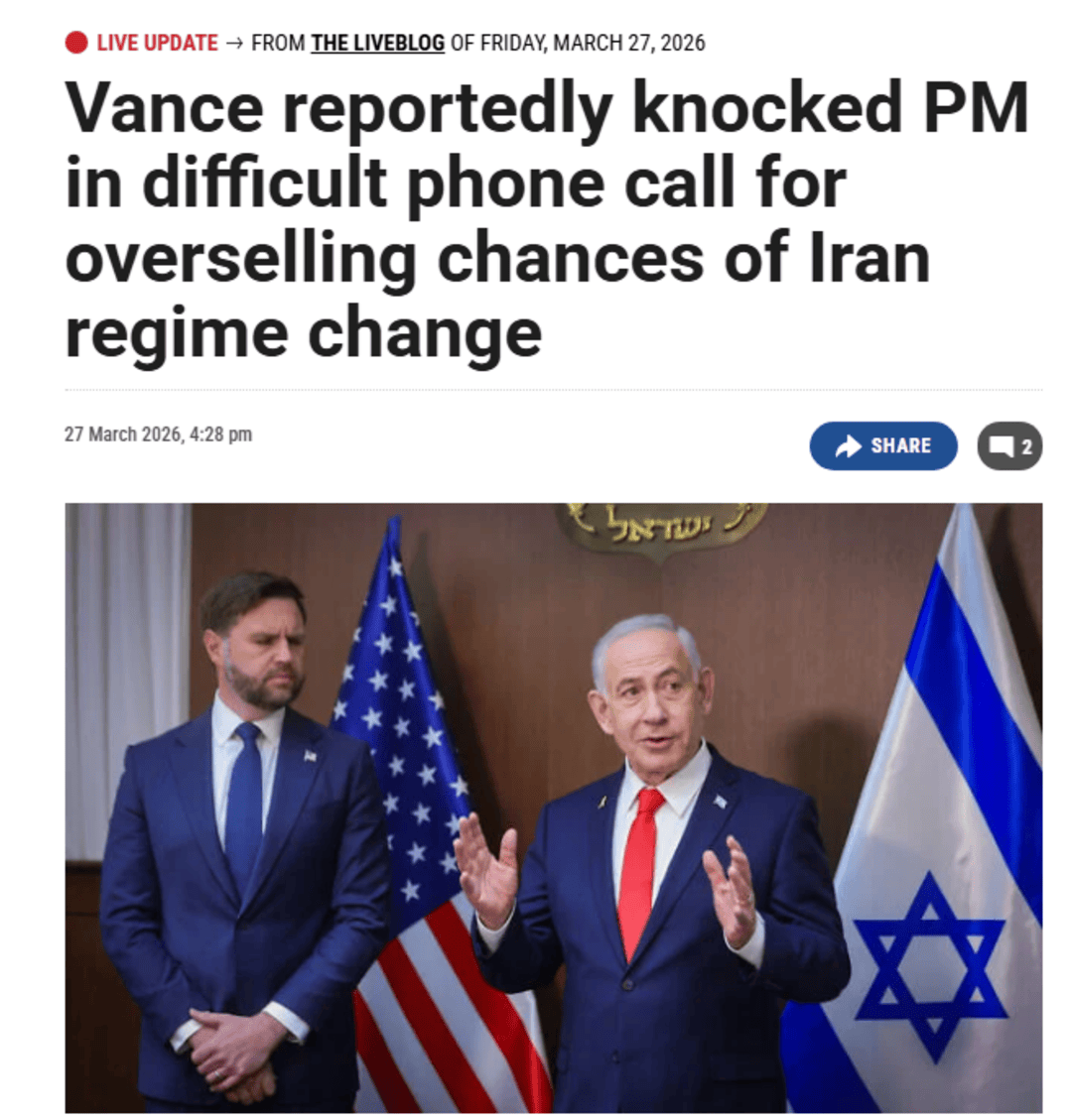此外,共和党内部高层也出现了“异样的声音”。按照以色列媒体的报道,美国副总统万斯近期在电话中“罕见地敲打了以色列总理内塔尼亚胡”,批评后者对这场战争的结果做出了“过于乐观的预测”。而在3月27日播出的一档访谈节目当中,万斯似乎已经开始给“美国退场”做铺垫。