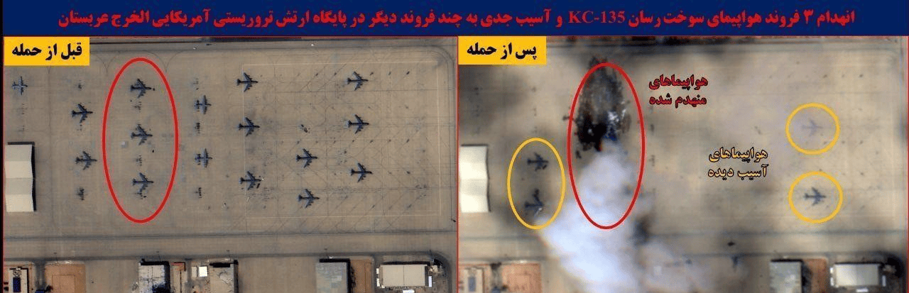 从目前各方公布的信息,可以推测出,当时伊朗向苏丹王子基地发射了6枚弹道导弹,其中2枚被拦截,4枚击中基地,仅可以确定,4枚弹道导弹的命中情况,一枚打中露天停机坪,停放的是加油机群,估计被击毁击伤KC-135加油机的数量不超过10架;一枚打中了机库群,击伤了至少两架C-130运输机,不确定为传中的EC-130H电子战机。一枚击中了滑跑道,击中了停放到该处的E-3预警机。一枚击中跑道前端,可能停放有F-16CJ战斗机,但是尚无法确定战果如何。