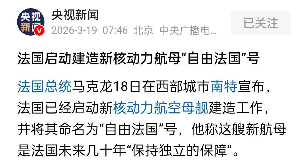 消息来源:央视新闻3月19日报道《法国启动建造新核动力航母“自由法国”号》