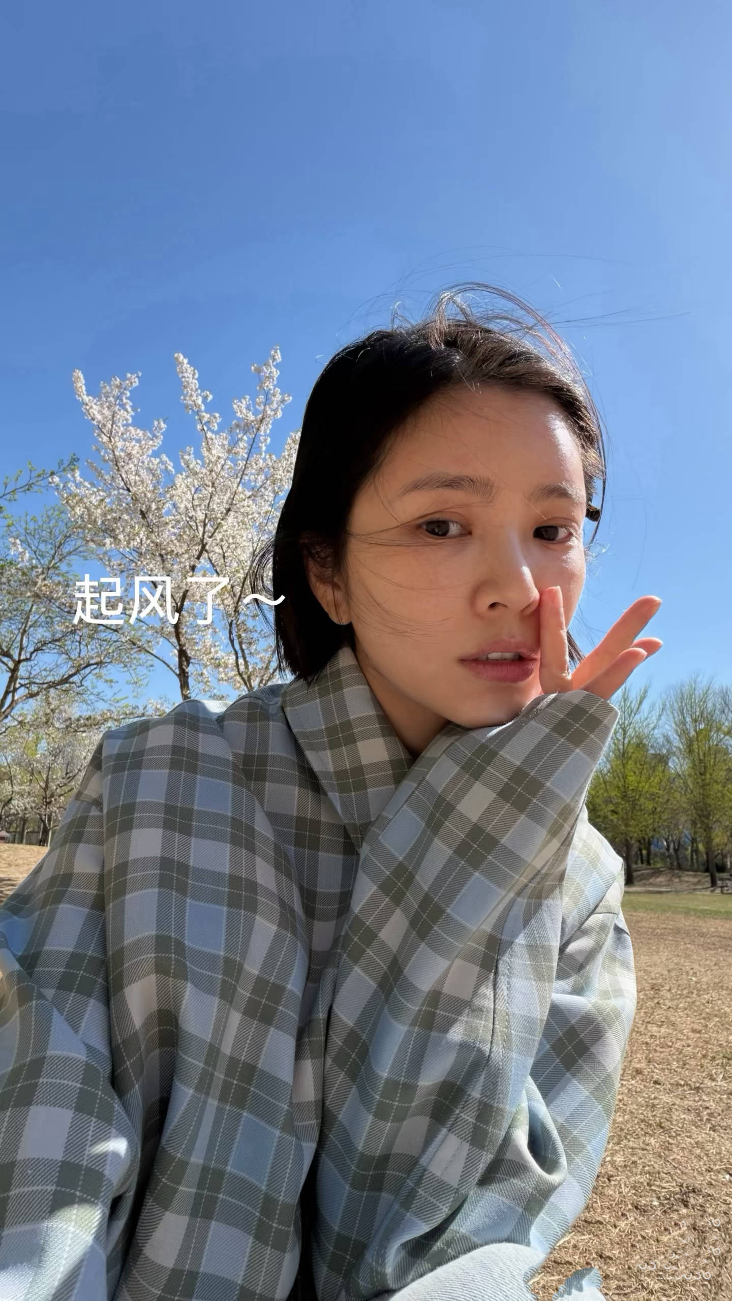 王灿还大方的晒出了素颜照,在同样的背景下、她对着镜头自拍。
