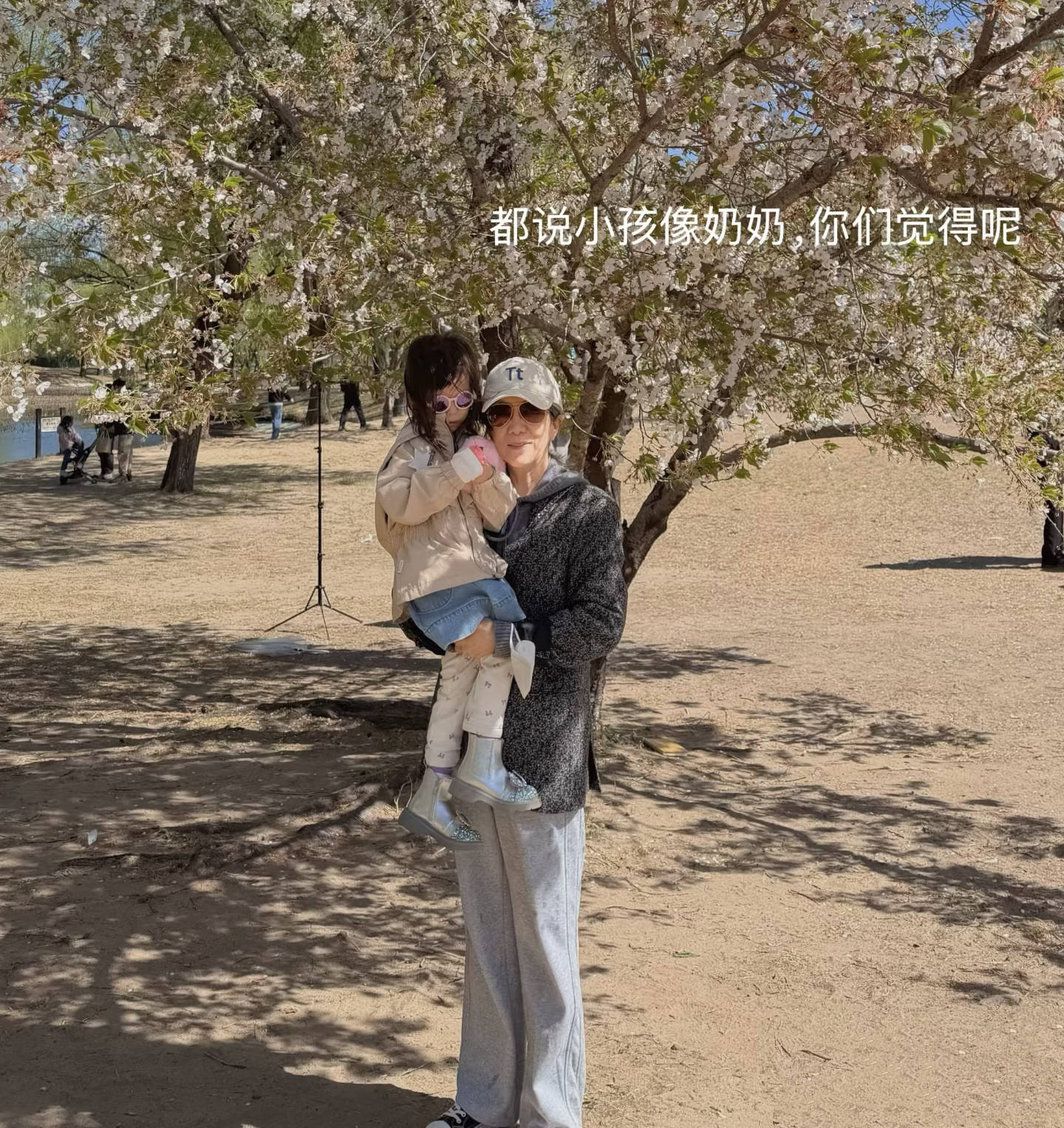 小蛋饺一直戴着小小的墨镜,只露出胖乎乎的脸蛋,不过小蛋饺的脸型倒是和奶奶挺像的。
