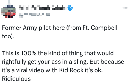 还有网民说,“我是前陆军飞行员,我可以说这种行为是100%会受到严厉处罚的。但如果是在跟摇滚小子拍网络视频,那就没问题。荒谬。”